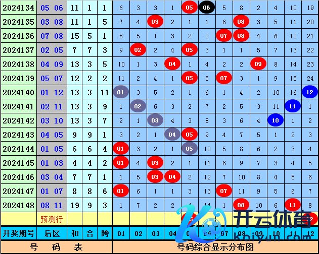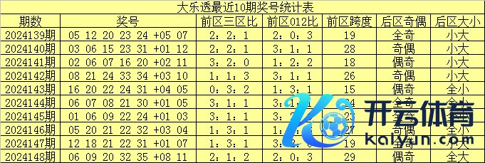 大乐透第2024148期奖号开出:06 09 20 32 35 +08 11。其中前区三区比为2:1:2体育录像/图片,012路比为2:0:3,后区开出全大、一奇一偶奖号。