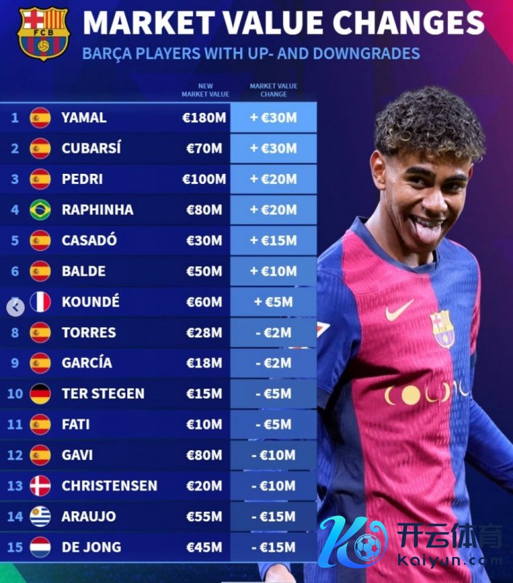 12月29日讯 《转会商场》在近日更新了西甲球员身价,并排出了巴萨球员身价变动情况,6东说念主高涨超1000万欧、4东说念主下落超1000万欧。 德转列巴萨身价变动:欧元 1.亚马尔,1.8亿,+3000万 2.库巴西,7000万,+3000万 3.佩德里,1亿,+2000万 4.拉菲尼亚,8000万,+2000万 5.卡萨多,3000万,+1500万 6.巴尔德,5000万,+1000万 7.孔德,6000万,+500万 8.费兰,2800万,-200万 9.加西亚,1800万,-200万