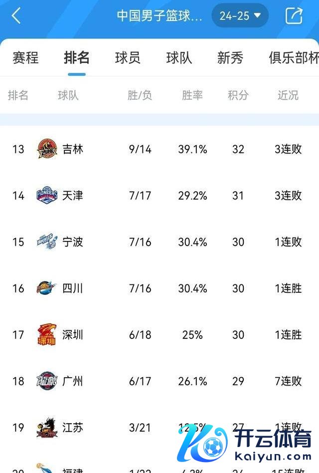 而天津队则在三连败的窘境中逗留,仍然停留在第14位。